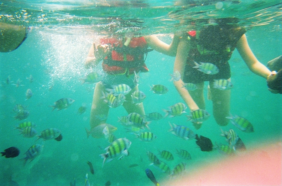 这次六人行都是第一次接触浮潜,我脑海想起小时候在脸盘里带着潜水镜练习了呼吸换气闭气之法......