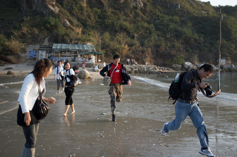 海边有个小离岛,在黄昏时,中间通道会潮涨,会被海水淹没,所以只能脱鞋走,当然也有懒人不想脱鞋的,如图~~~凌波微步~~~
